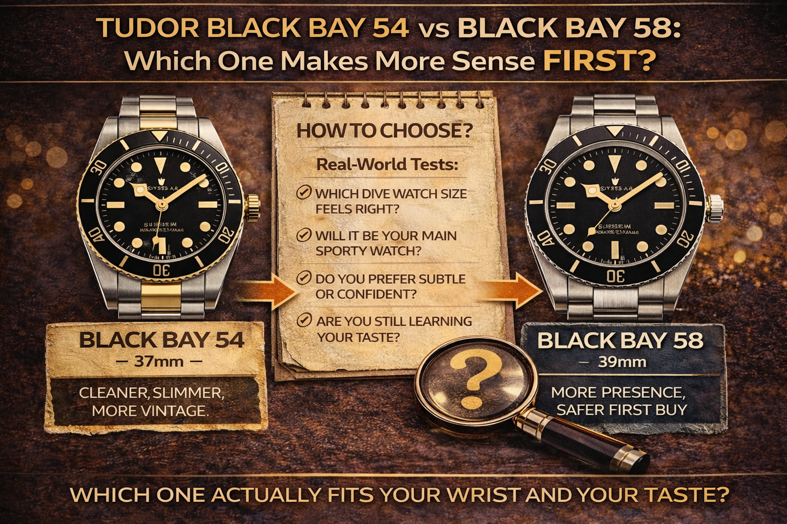 The Tudor Black Bay 54 is the better first buy if you already know you love compact, vintage-correct proportions. The Black Bay 58 is the safer first choice for most buyers because it offers a more familiar dive-watch fit, more wrist presence, and a stronger modern technical package.