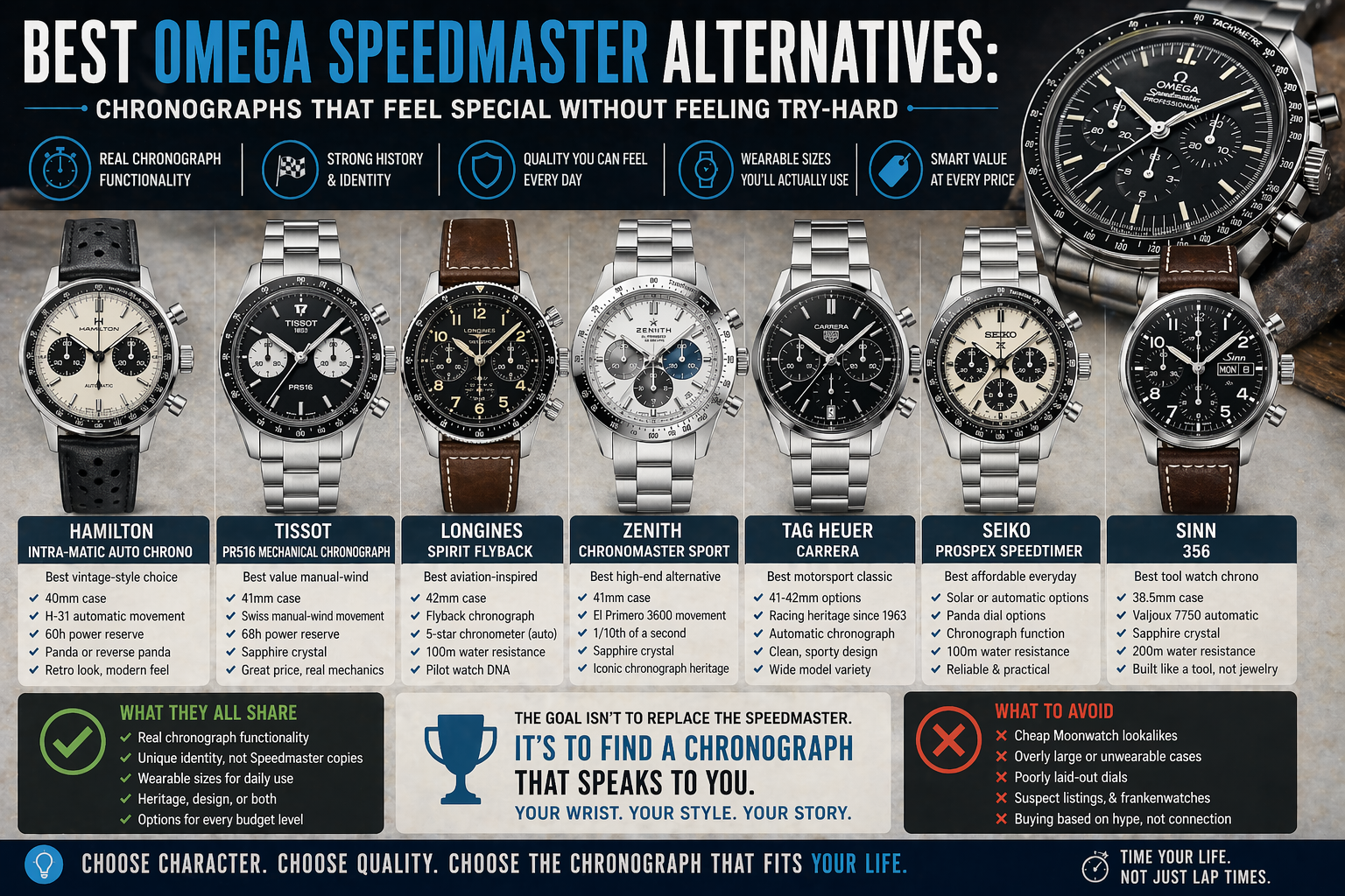That is why the Speedmaster is so hard to replace. It is not just a chronograph. It is one of the most recognizable chronographs ever made. And when a watch becomes that iconic, alternatives get tricky. The bad ones feel like costume versions. The good ones solve the same emotional problem in their own way.