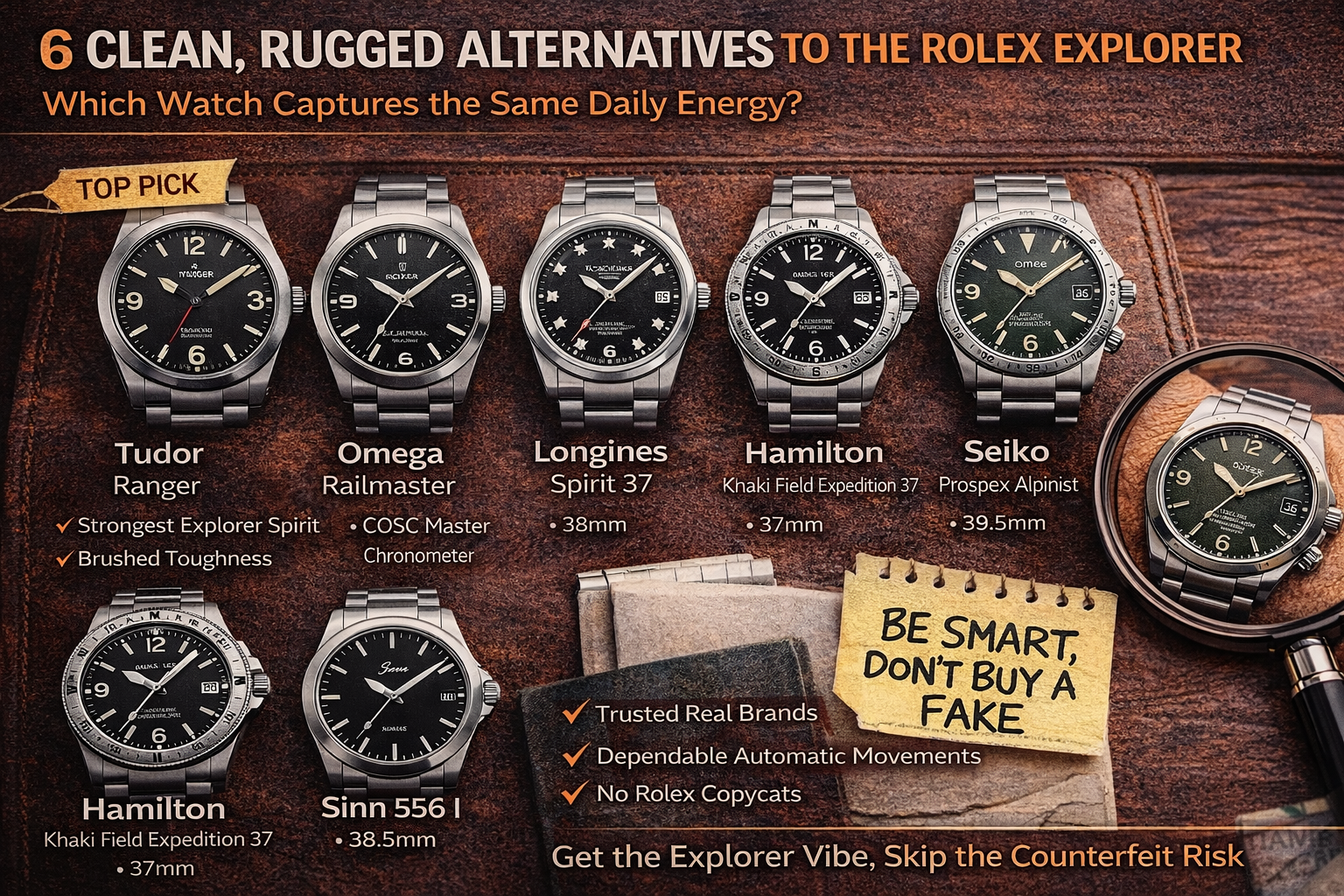 The best Rolex Explorer alternatives are the Tudor Ranger, Omega Railmaster, Longines Spirit 37, Hamilton Khaki Field Expedition 37, Sinn 556 I, and Seiko Alpinist. The right one depends on whether you want the closest Explorer spirit, the best value, more technical credibility, or simply a clean rugged everyday watch that stands on its own.