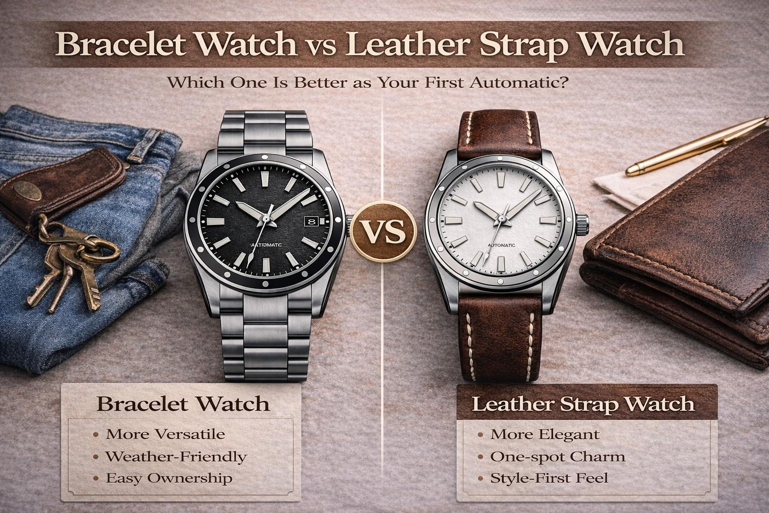 If you are still early in the learning stage, it helps to start with What Is an Automatic Watch? Pros, Cons & Who Should Buy One and Best Automatic Watches for Beginners: Top Picks & Buying Tips. But if your real question is “bracelet or leather for my first automatic?”, this guide is the practical version.