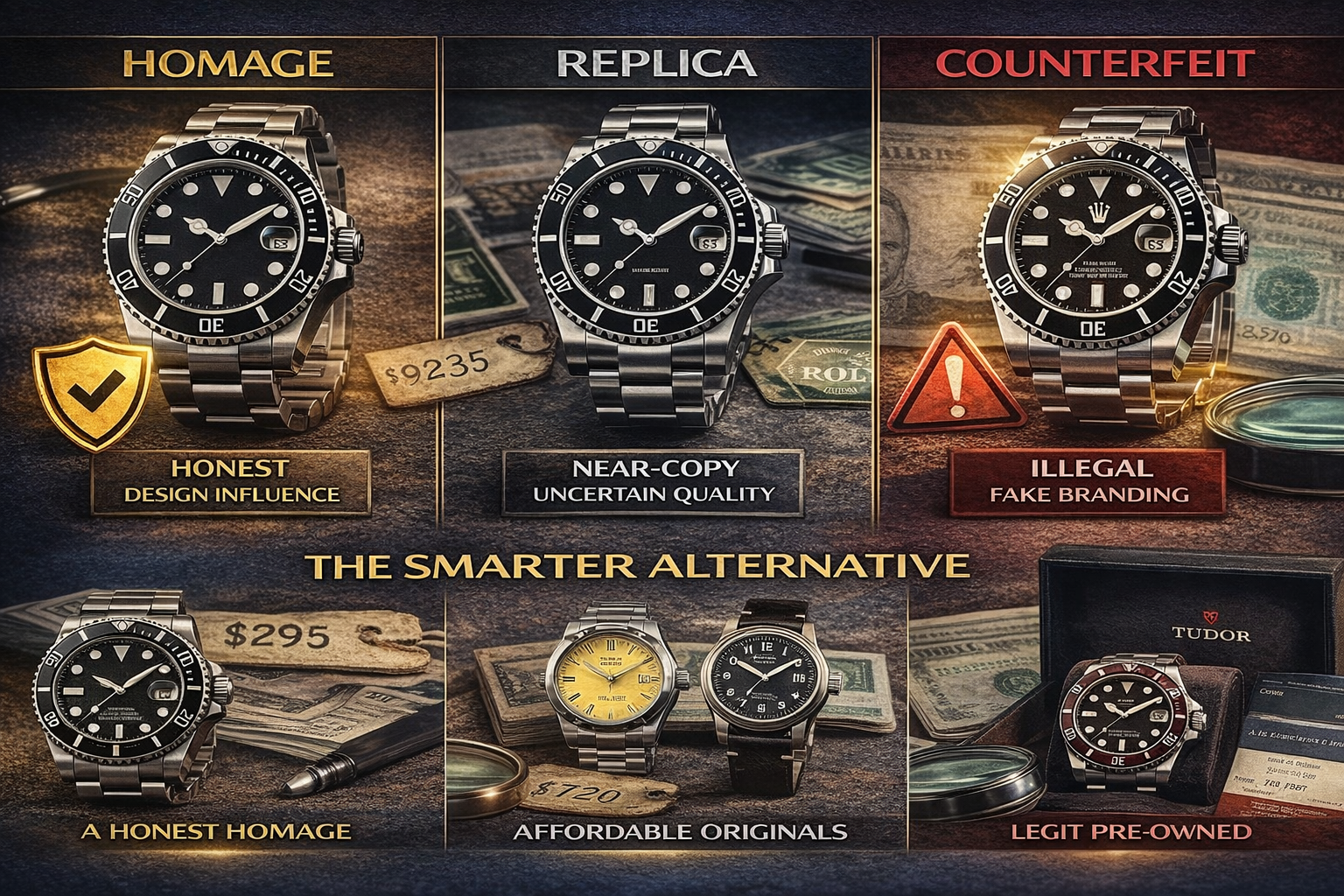 If you care about style, value, long-term satisfaction, and avoiding a bad purchase, you need to separate homage, replica, and counterfeit clearly before spending money.
