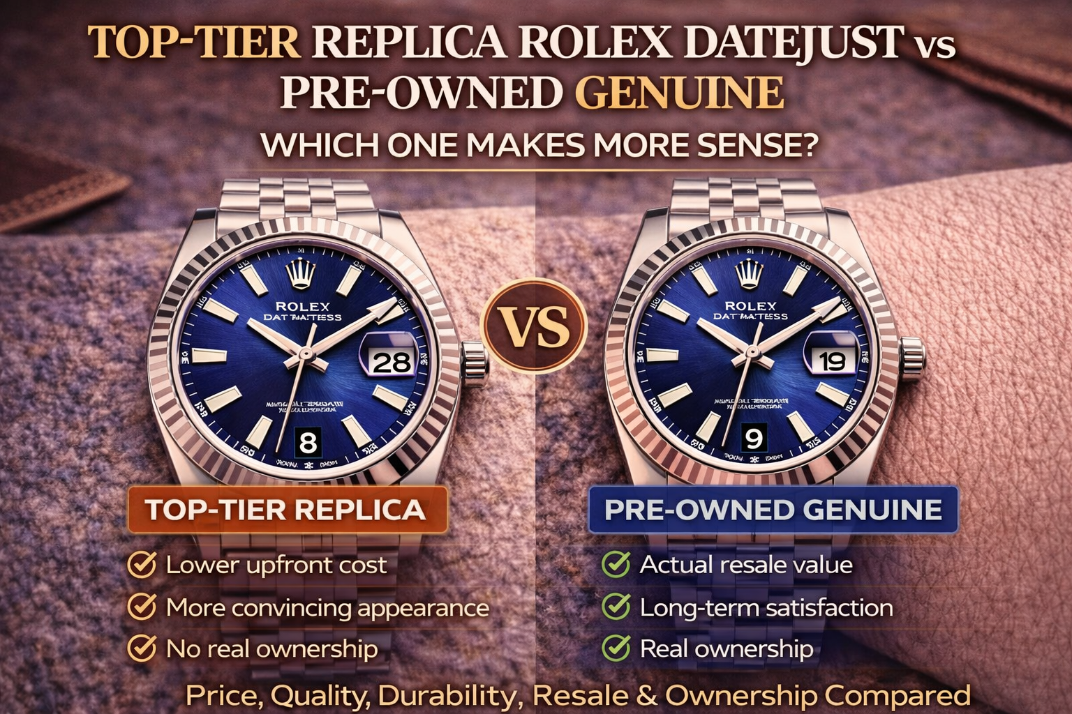 If you are asking which one makes more sense between a top-tier replica Rolex Datejust and a pre-owned genuine Datejust, the serious answer is the genuine watch.