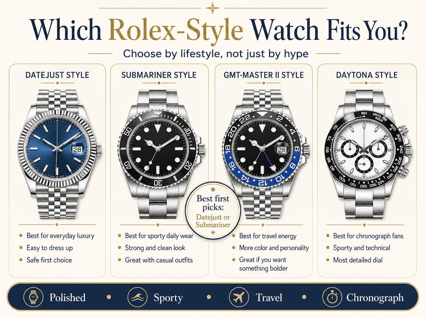 Choose a Datejust-style replica if you want the safest and most versatile first Rolex-style watch.