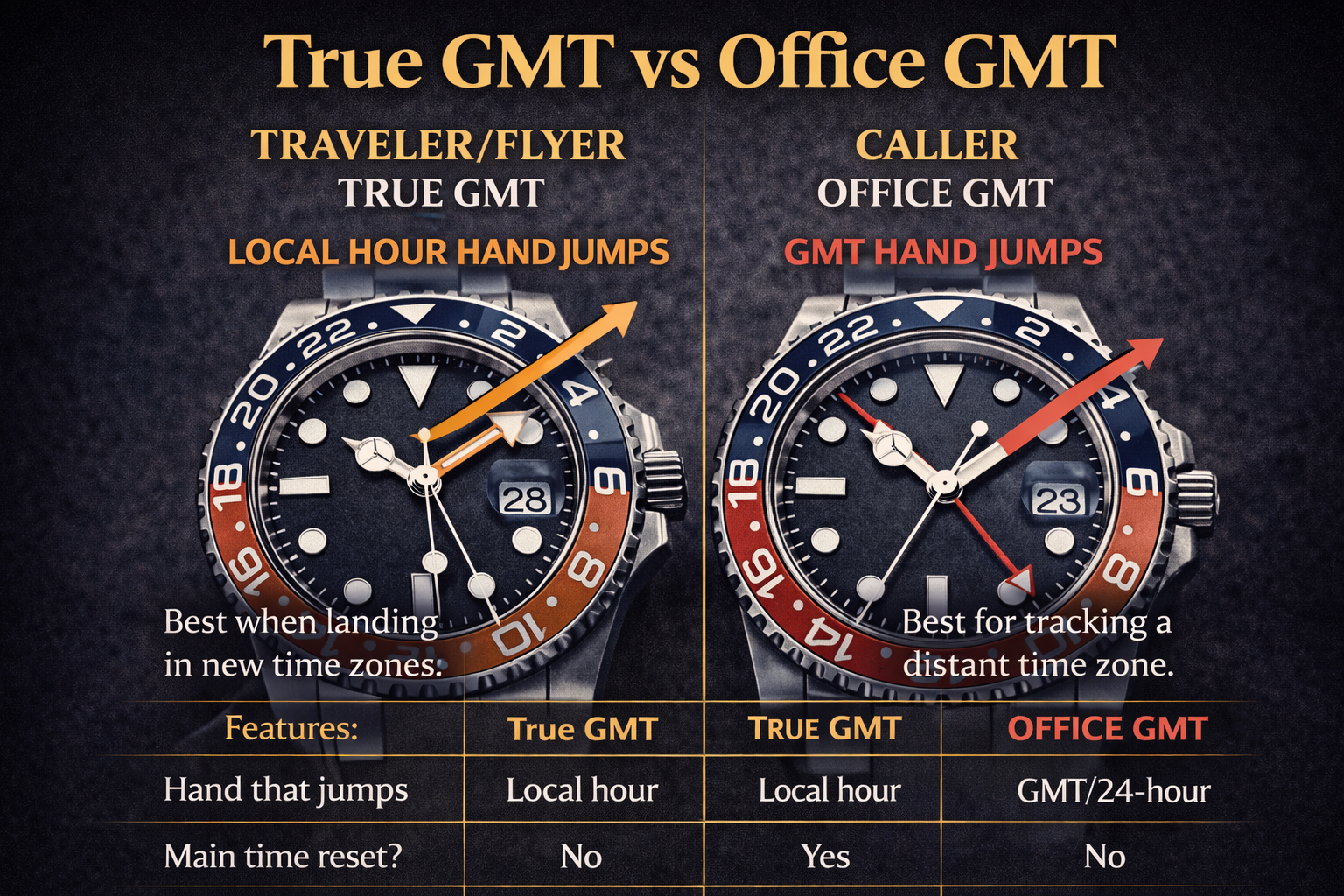 If you’ve read about GMT watches, you’ve probably seen two confusing terms: “True/Traveler GMT” and “Office/Caller GMT.” Both display a second time zone—but they’re set differently, and one is much more convenient for frequent travel.