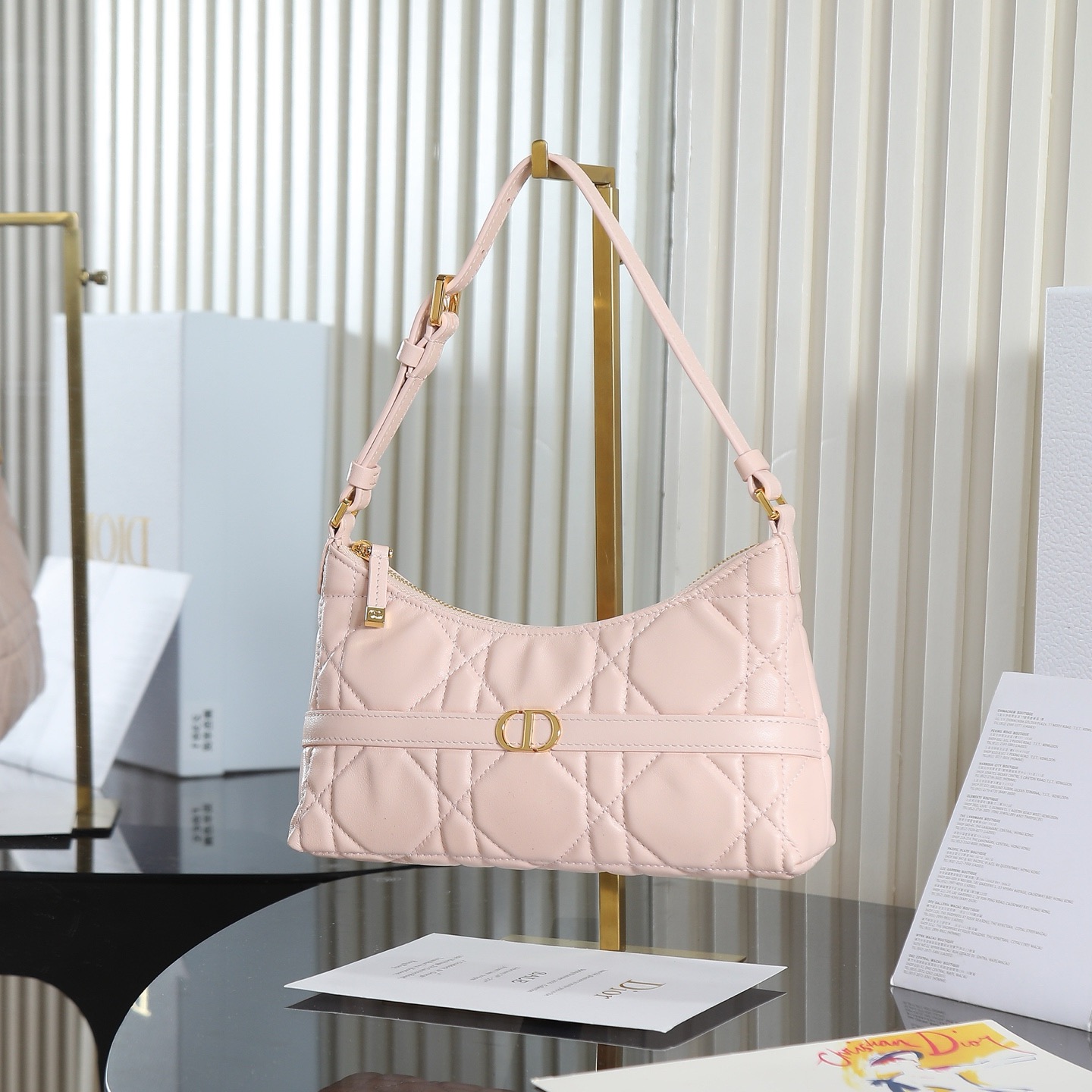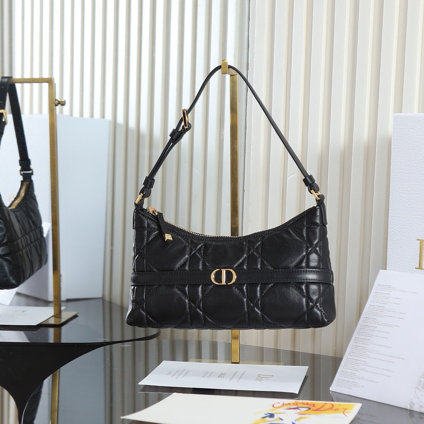 This mini shoulder bag is a new addition to the 2025 Early Spring/Summer collection, enriching the Miss Caro line with stylish and sophisticated pieces. Crafted from black lambskin, it features oversized cannage stitching for added elegance, a decorative tonal strap, and a vintage gold-plated CD logo on the front. A zippered compartment offers ample storage for everyday essentials, and the adjustable leather shoulder strap allows for an elegant crossbody look.