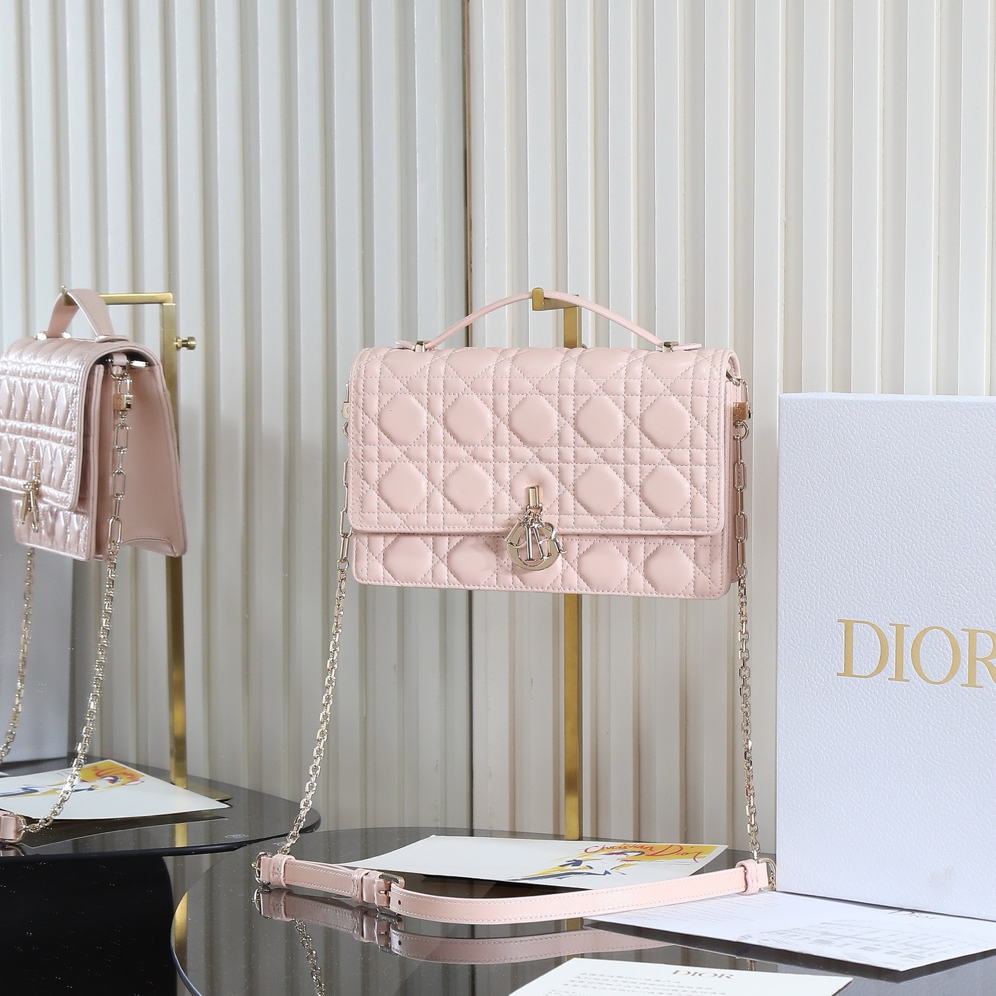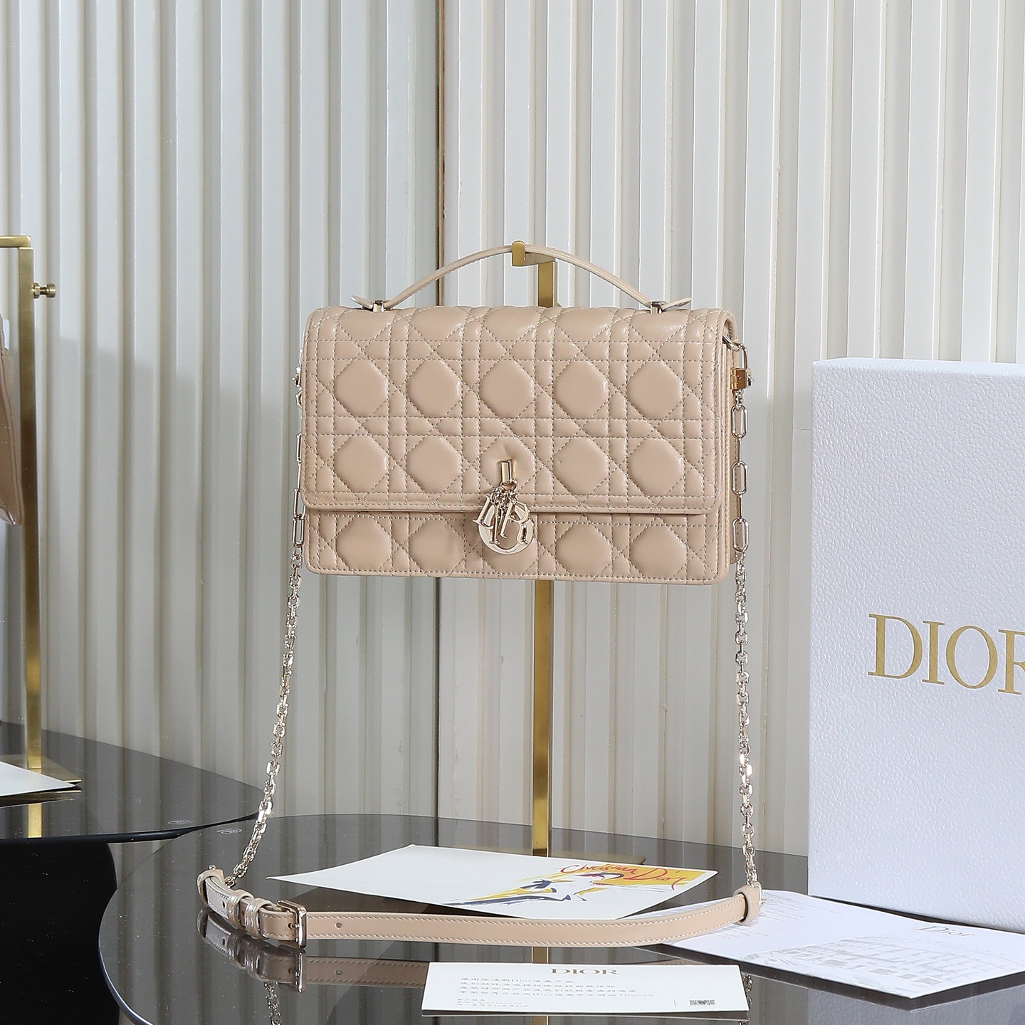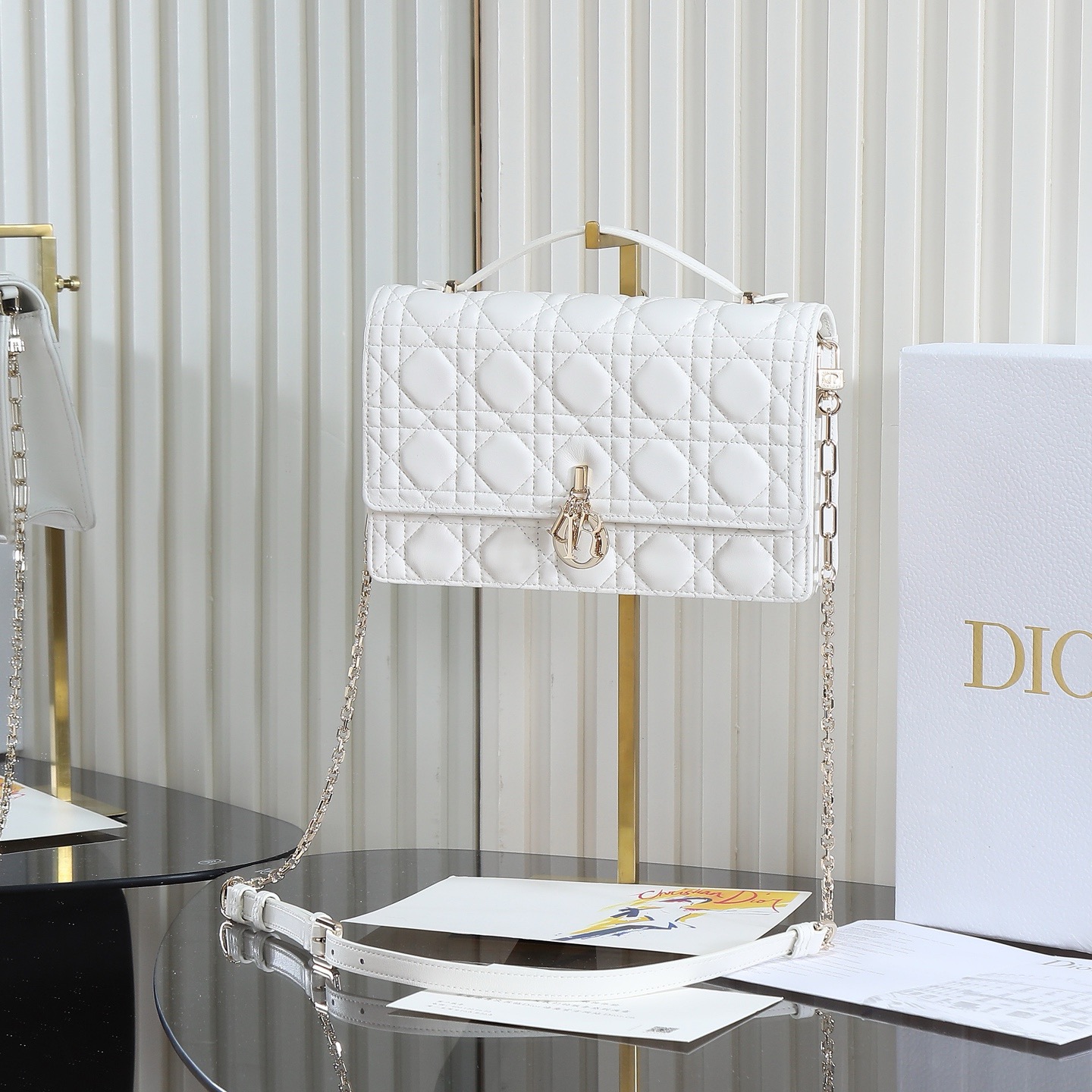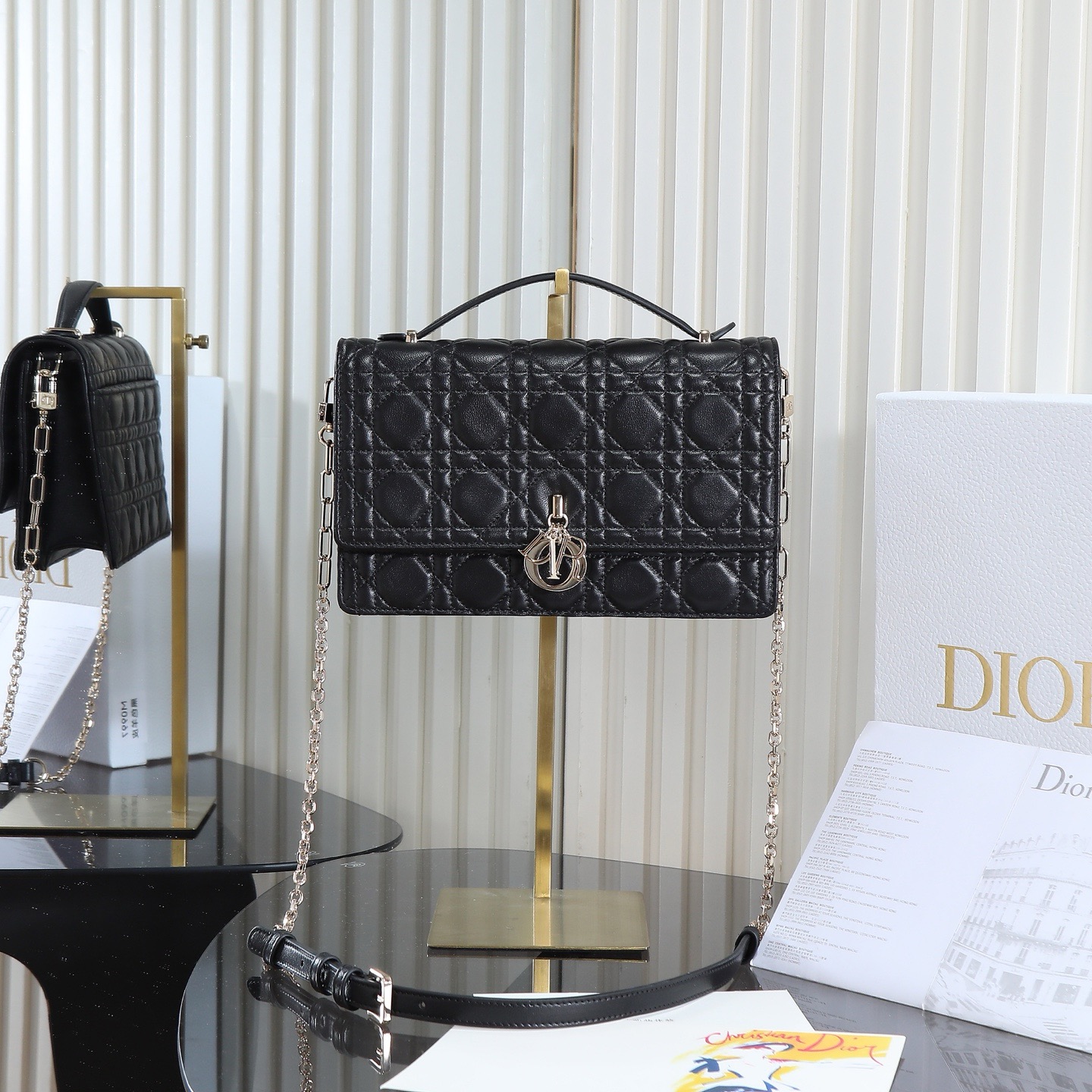 A new addition to the 2024 Early Spring collection, elegant and practical. Crafted from black lambskin leather with cannage stitching, the flap is adorned with a d.i.o.r. charm. Two compartments and a zippered clutch offer ample storage for everyday essentials, suitable for both casual and evening looks. The classic top handle comes with a detachable chain shoulder strap with a leather strap, allowing for hand-carrying, shoulder-carrying, or crossbody wear.