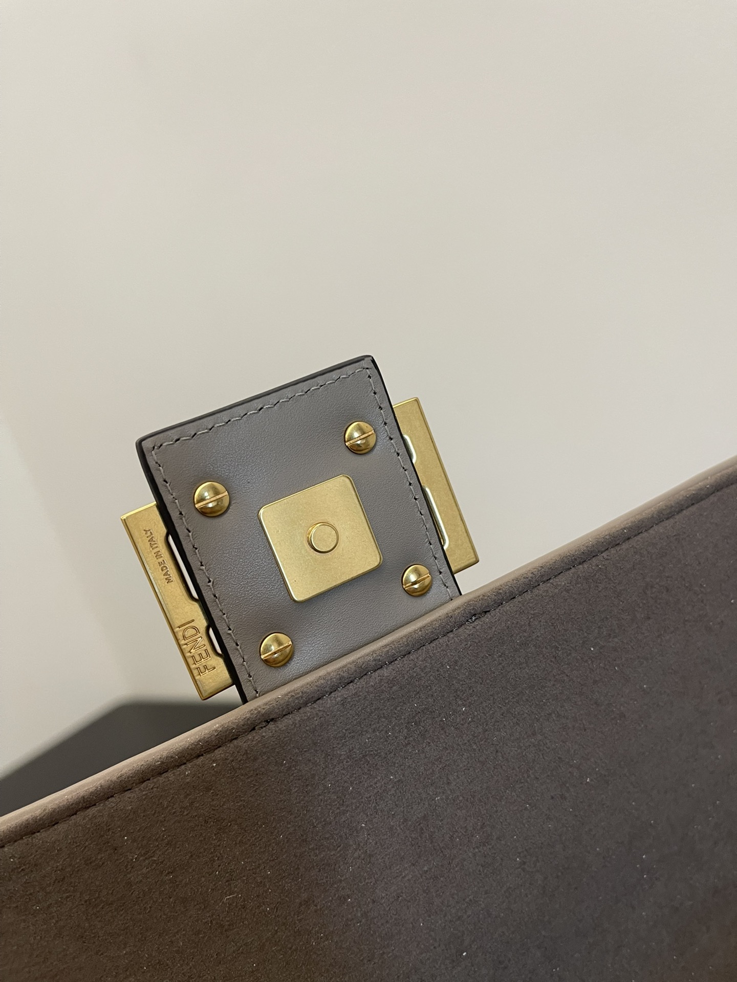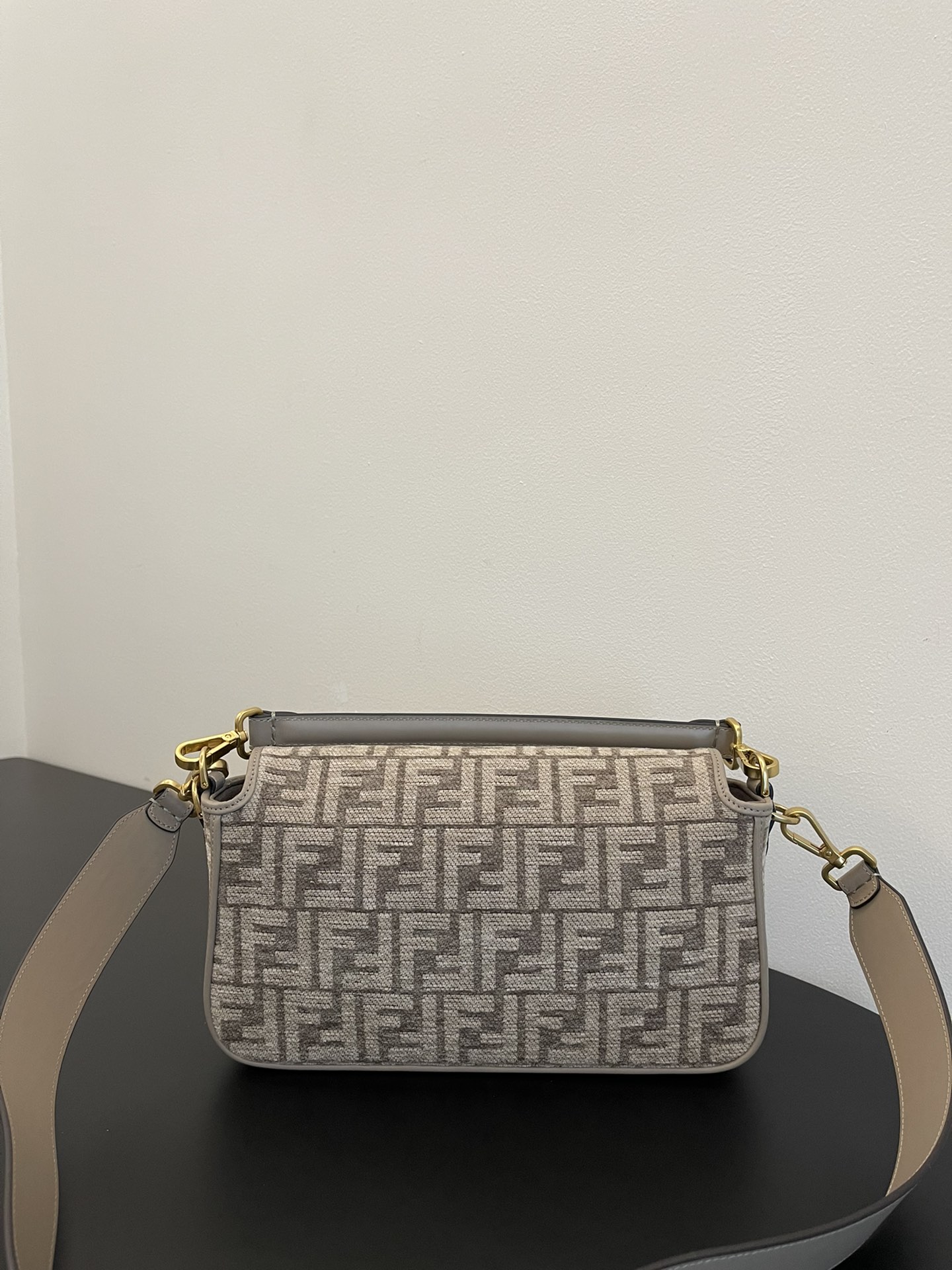 Made of chenille with an F brocade pattern, accented with tonal leather details and adorned with an FF clasp. Features a front flap, magnetic closure, interior compartment with eagle-skin lining and a zip pocket, and vintage gold-tone hardware. The bag comes with a detachable leather handle and shoulder strap, allowing for hand-carrying, shoulder-carrying, or crossbody wear. Dimensions: 26 x 13 x 6 cm